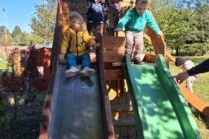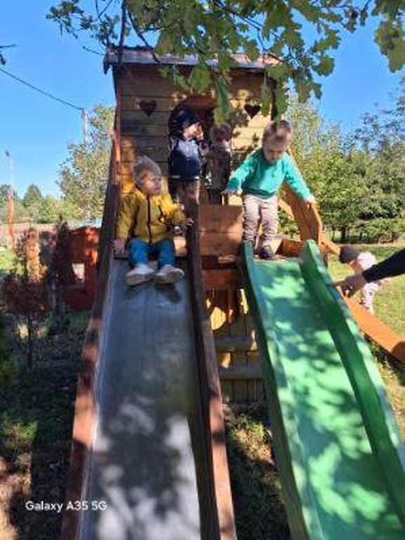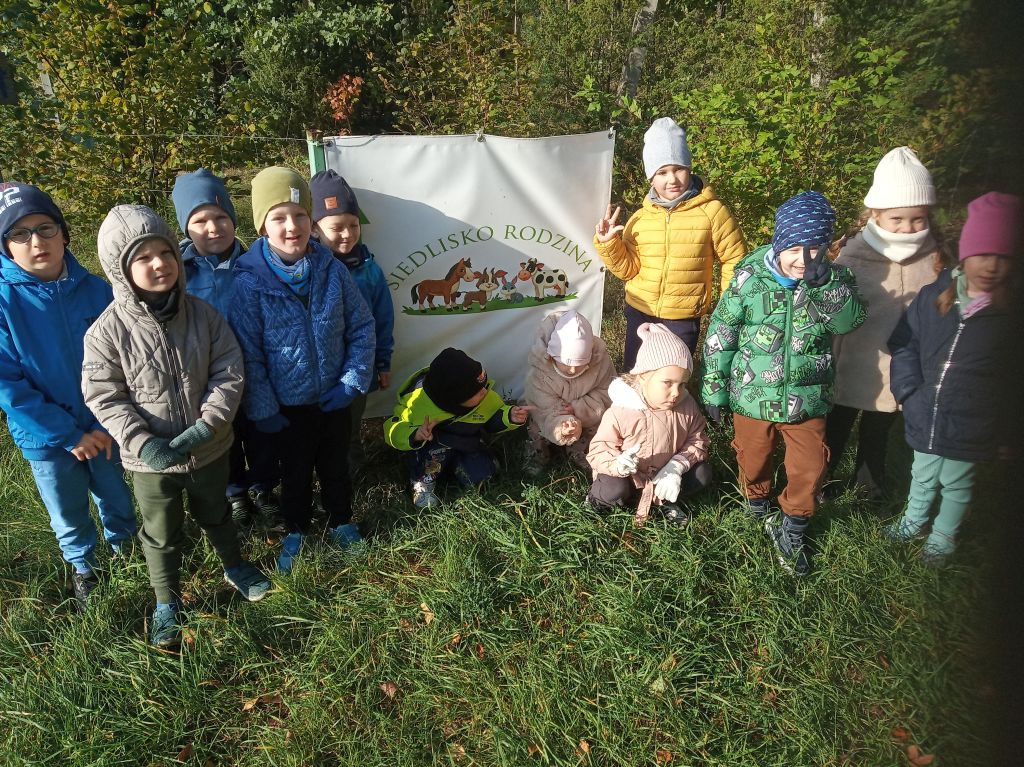 W dniu 1 października 2025r. dzieci z grupy III i IV „Kraina Misia Kolargola” i „Kraina Misia Padingtona” wybrały się na niezwykłą wycieczkę edukacyjną do gospodarstwa na Podlasiu „Siedlisko Rodzina. W urokach jesiennej aury dzieci poznawały i karmiły zwierzęta gospodarcze – dowiedziały się, jak wygląda ich życie i miały okazję samodzielnie je nakarmić. Przedszkolaki poszukiwały skarbów leśnych na ścieżce edukacyjnej „Drzwi do lasu”, wykazały się sprawnością intelektualną i fizyczną: rozwiązując zagadki przyrodnicze oraz uczestnicząc w grze terenowej, pokonując różnorodne ruchome przeszkody: kładki, mostki, liny. Ćwiczyły koordynacją ruchową i równowagę pokonując naturalne tory przeszkód: konary, pnie, gałęzie. Na zakończenie bawiły się na placu zabaw korzystając z różnorodnych zabawek, rozgrzewały się ciepłą cytrynową herbatką i próbowały kiełbasek i upieczonych ziemniaków w ognisku.